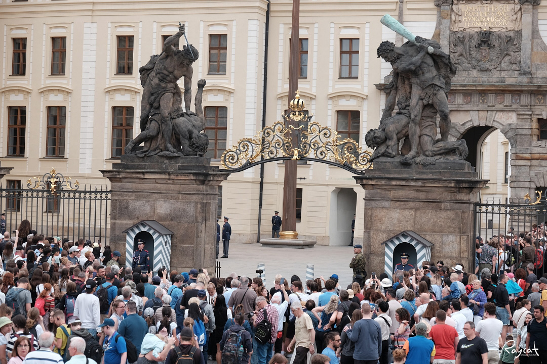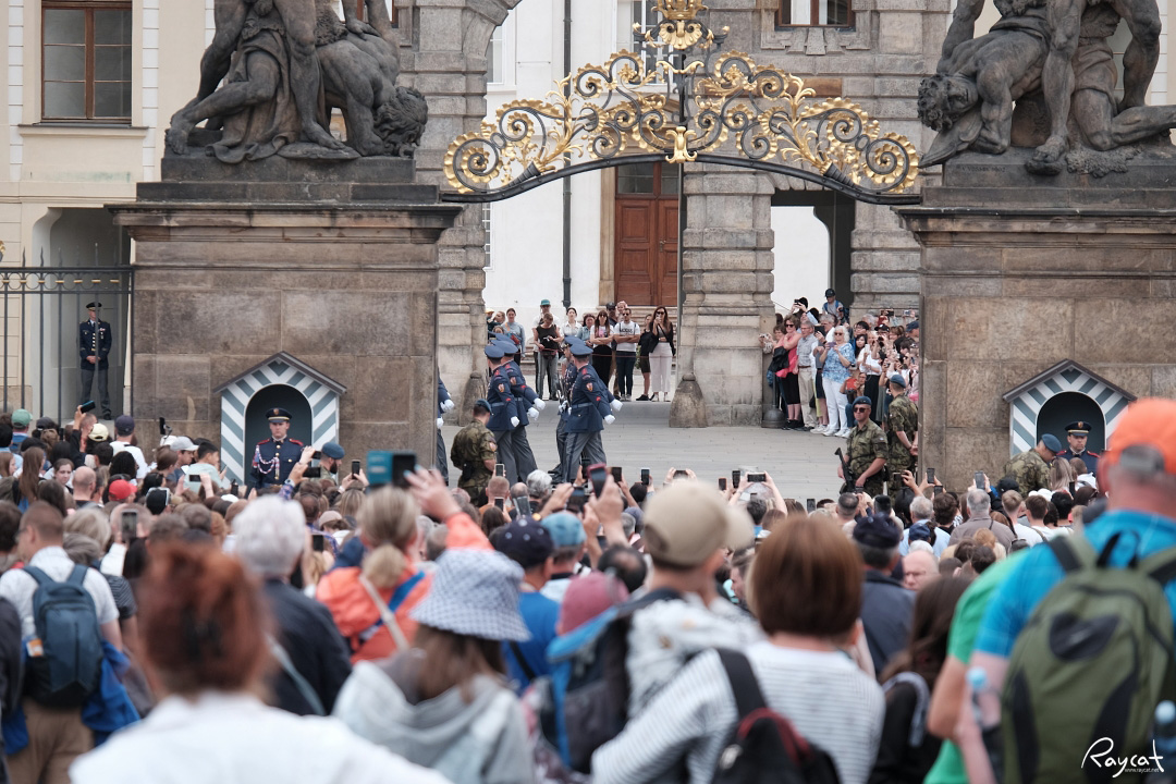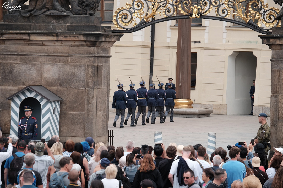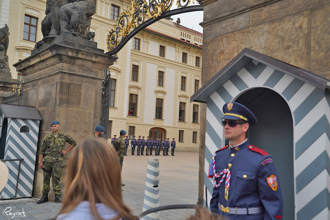 정오가 되면 체코 국가인지 아니면 군대 행진곡인지 모르겠지만 음악이 울려 퍼지며 성 입구의 반대쪽 군 숙소에서 부터 근위병들이 내려오는데 12시 정각이 되기 전 10분 전 도보로 근위병들이 행진을 시작한다.