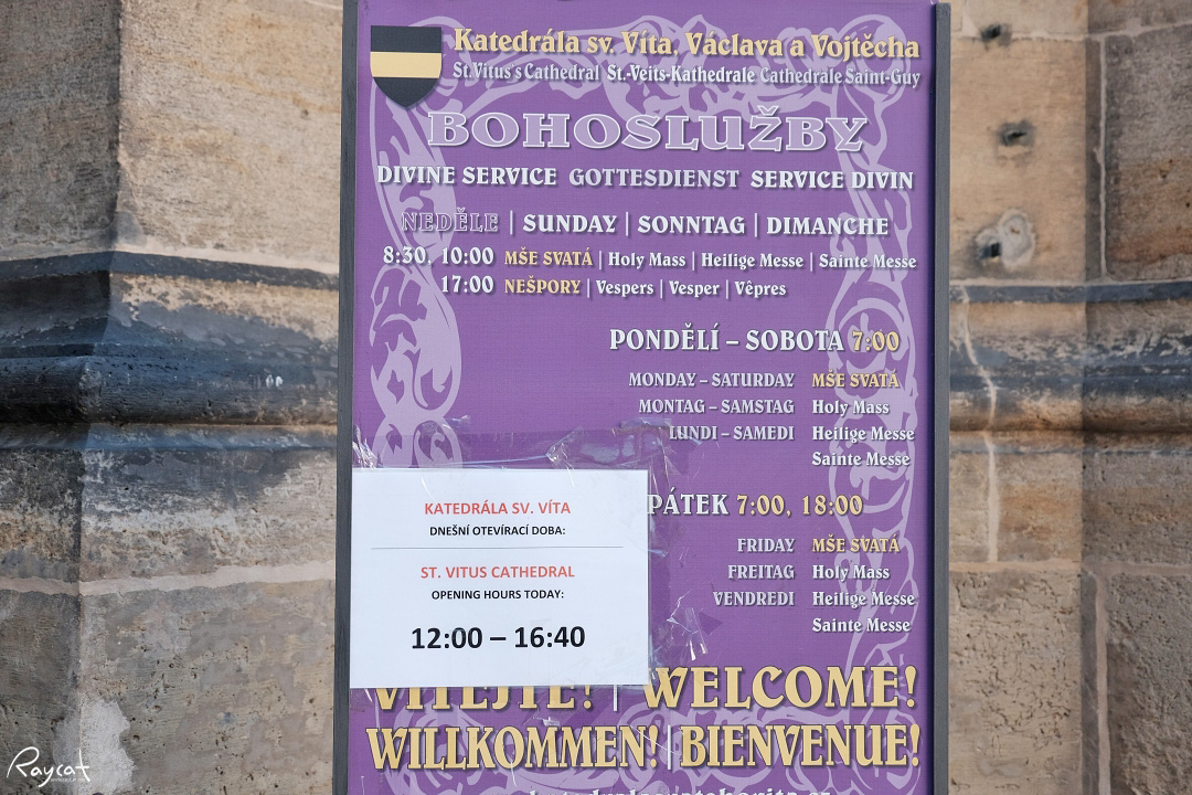 프라하 성에 도착해서 티켓팅을 하고 안으로 들어오면 이 성비투스 대성당을 지나게 되는데 입구에 특별한 행사가 있는 날은 오픈 시간 안내가 있으니 이거 확인해 보고 프라하성 탐방을 하는 것이 좋다.
