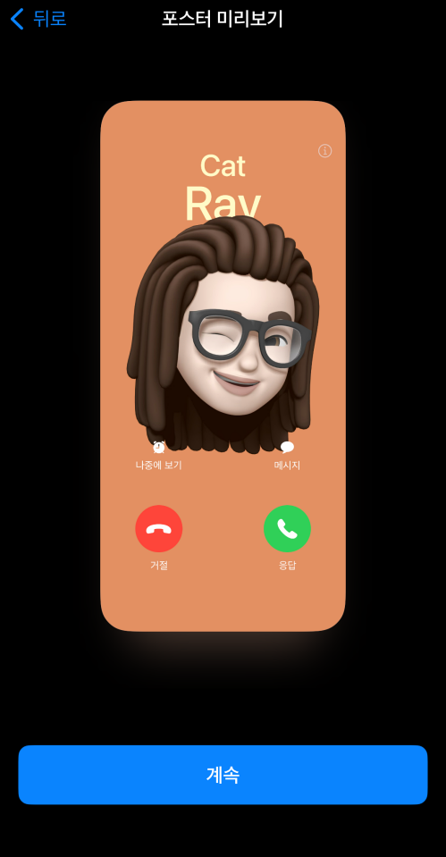 iOS17의 연락처 포스터는 사진이나 미모티콘으로 만들 수 있는데 상대방한테 보이는 이미지이기 때문에 자신을 잘 표현할 수 있는 사진이나 미모티콘을 적용하면 좋을 것 같습니다.