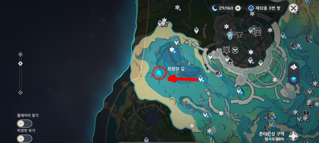 '호숫가의 비비안느'는 폰타인성 가장 북부, 무기 돌파 재료 비경 우측 상단의 동산 뒤편에 있습니다.