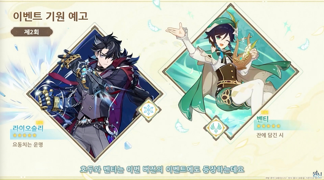 그리고 후반부 픽업은 '라이오슬리'와 '벤티'이며 4성은 '토마', '도리', '중운'으로 예측되고 있습니다.