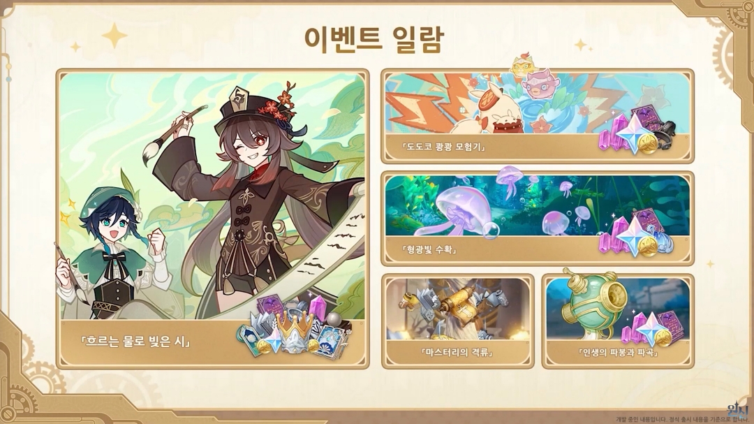 그리고 마신 임무를 제외하고 다른 이벤트는 '흐르는 물로 빚은 시'에 벤티와 호두가 등장하며 클레와 함께 진행하는 '도도코 쾅쾅 모험기'가 있으며 리월과 몬드에서 오랜만에 이벤트가 진행됩니다.