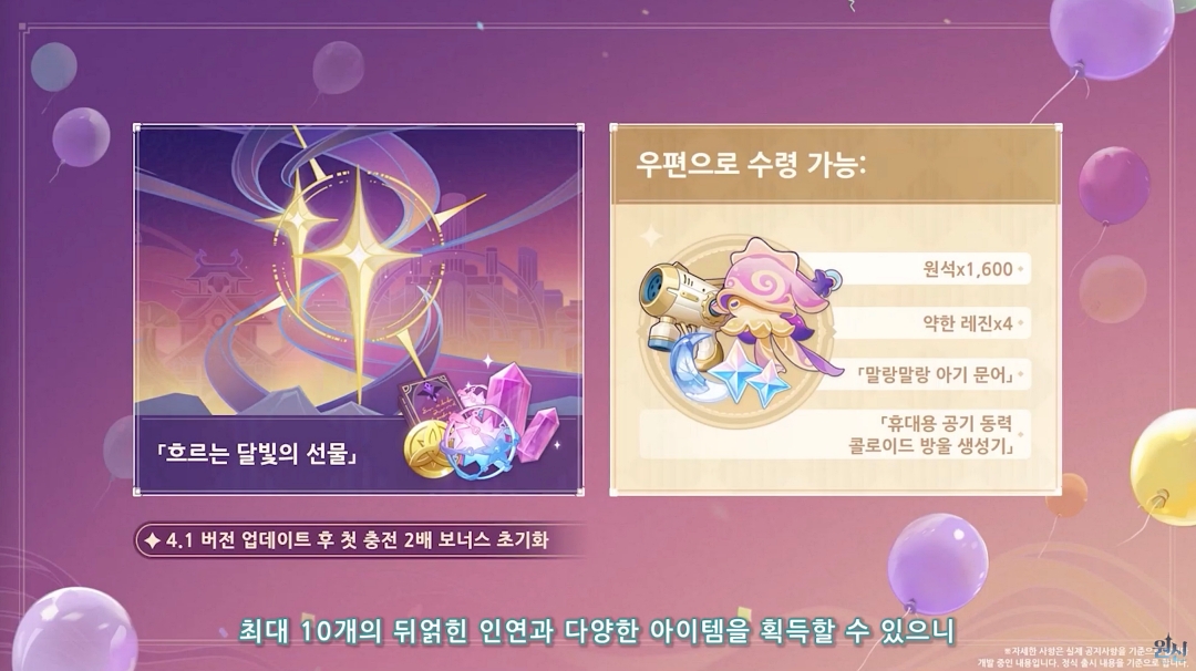 그리고 3주년을 기념한 보상도 있는데 4.1 버전 업데이트 후 '첫 충전 2배 보너스 초기화', 매일 출석으로 '뒤얽인 인연' 10개와 모라, 경험치책등 캐릭터 육성 소재를 받을 수 있습니다.
