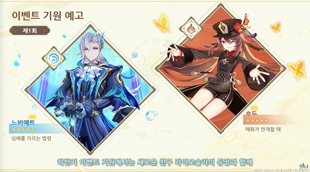 원신 4.1 5성 픽업을 보면 서포터인 '벤티'를 제외하면 모두 메인딜러인데 폰타인 신캐인 '느비예트', '라이오슬리', '호두' 모두 메인딜러 포지션으로 전후반 모두 픽업은 괜찮아 보이는데 '느비예트'와 '라이오슬리'의 경우 물과 얼음 원소입니다.