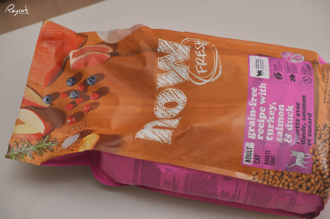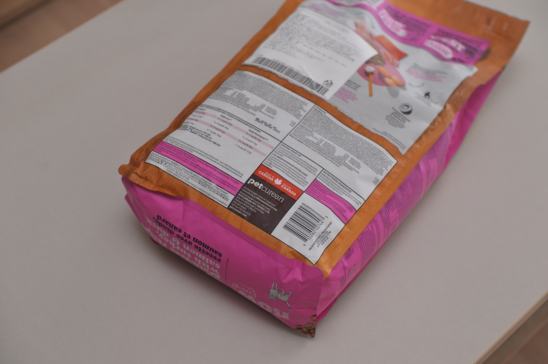 대부분의 사료는 뒤쪽에 성분이 나와 있는데 탄수화물이 10% 이하로 낮은데 고양이의 경우 탄수화물 함량이 높으면 제대로 소화를 못하는 고양이들이 있어서 그레인 프리 사료를 먹이는 경우도 있다.