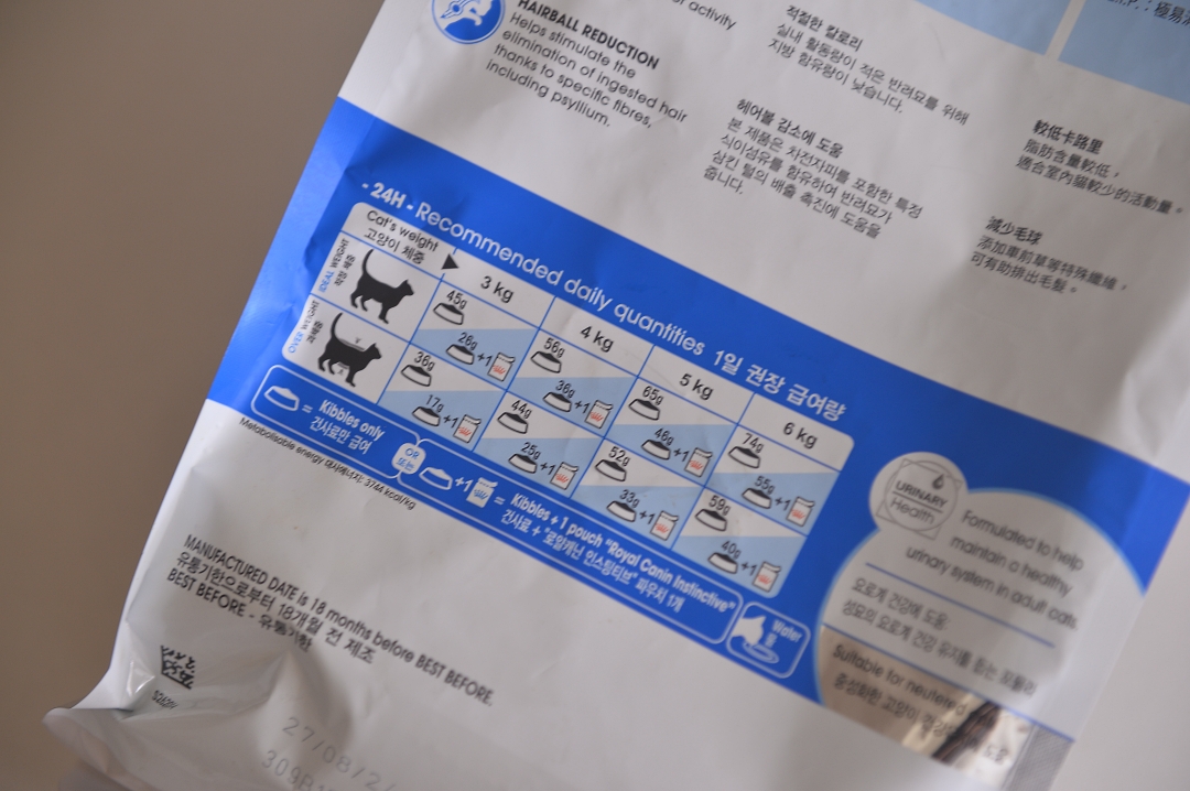 뒤쪽에 사료의 성분이 있고 일일 급여량이 있는데 고양이의 몸무게에 따라 적정 급여량이 표기되어 있으며 로얄캐닌 성묘용 사료는 13개월에서 7살까지 먹는 사료다.