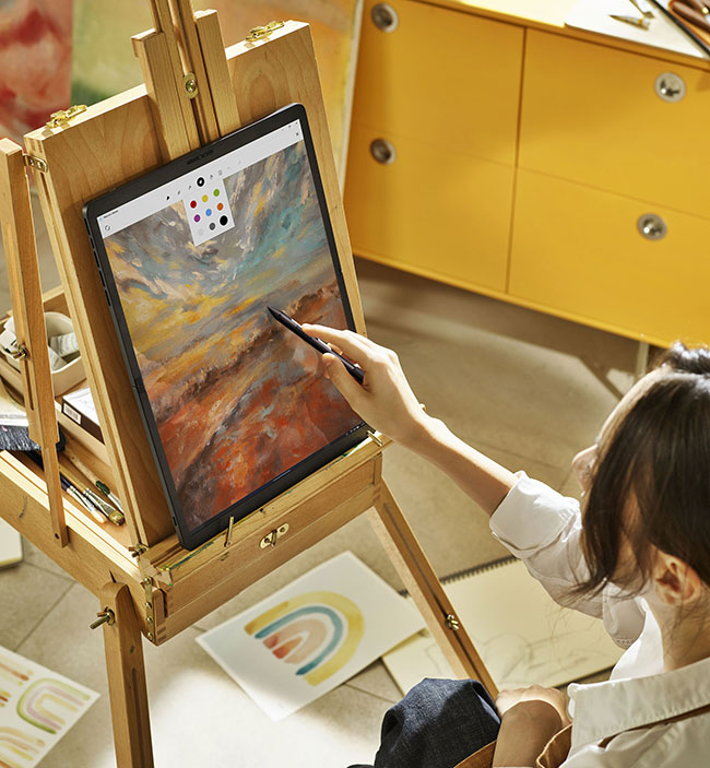 스타일러스 펜도 지원하기 때문에 펜을 활용한 다양한 창작 작업이 가능하며 화면을 반으로 나눠 태블릿처럼 활용하거나 필요에 따라서 노트북처럼 사용할 수 있습니다.