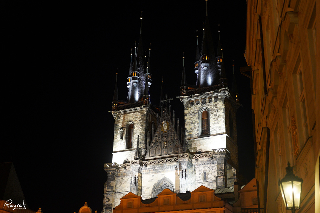 고딕건축 양식을 잘 보여주는 틴성모 마리아 교회는 프라하성 비투스 대성당과 함께 프라하를 대표하는 교회로 뾰족탑은 야간에 조명이 들어오면 더 화려하게 보인다.