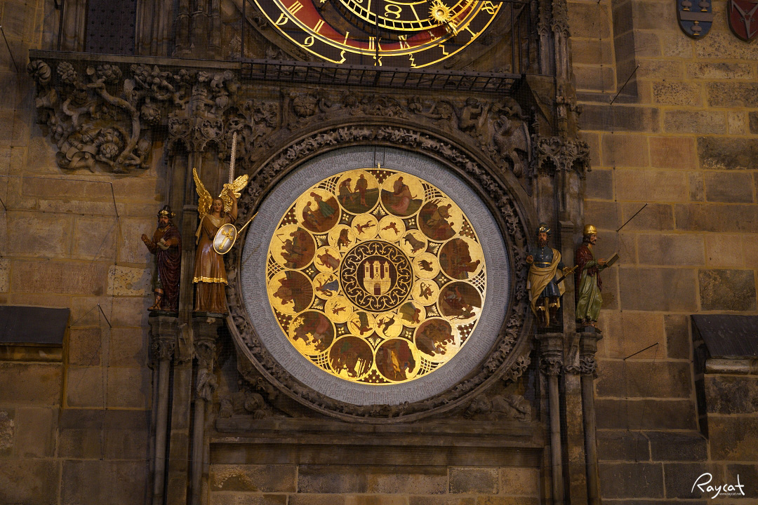 위 사진에서 시곗바늘 없이, 모든 것이 그림판으로 이루어진 이 시계는 중앙의 탑 세 개가 있는 기호는 프라하 어디서든지 볼 수 있는 프라하 도시마크다.