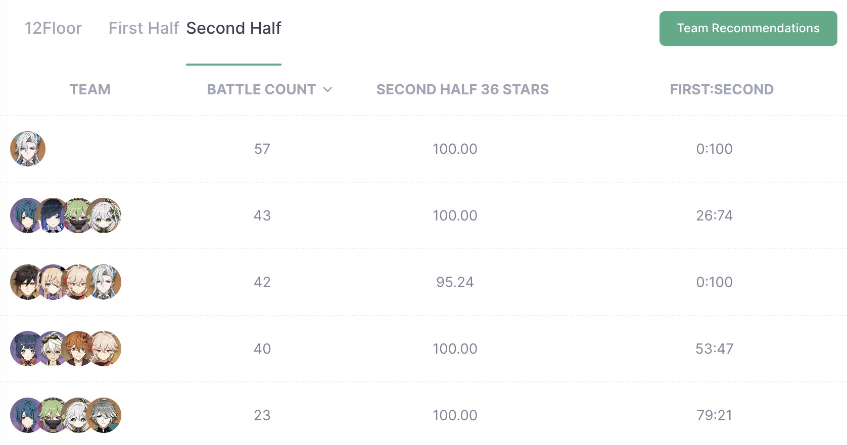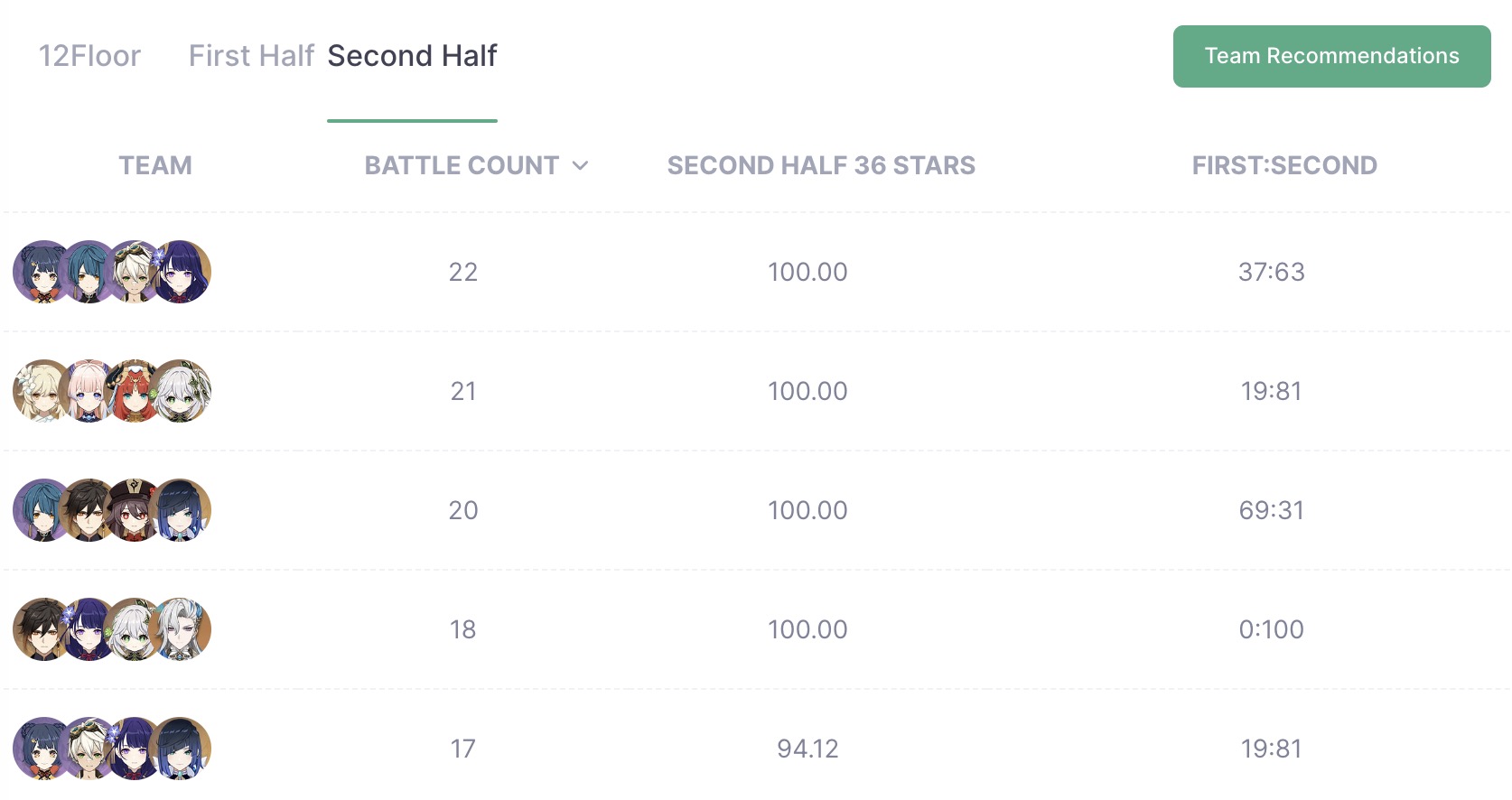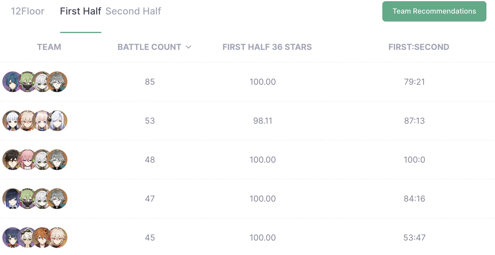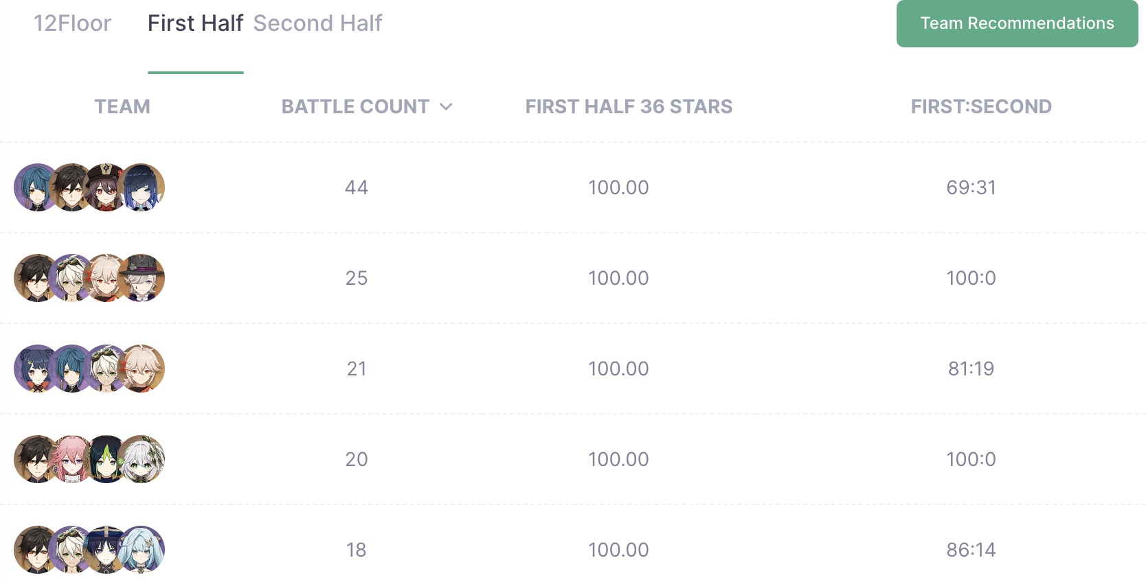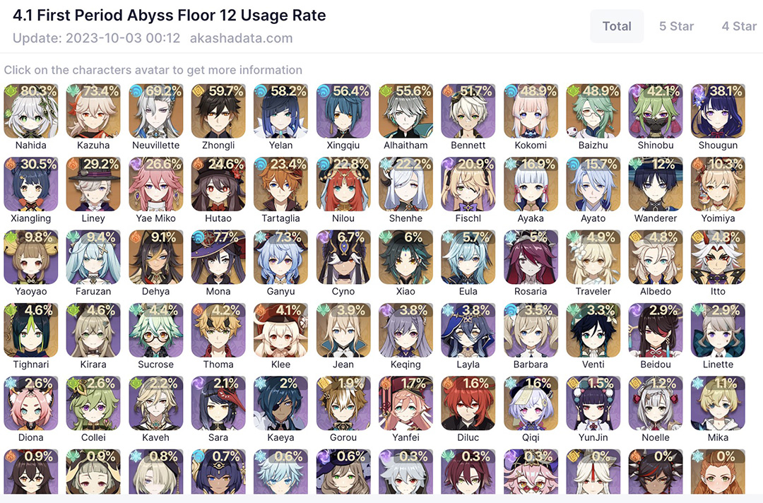 원신의 최종 콘텐츠가 지금 나선비경 12층뿐이라 매번 새로 시작할때 마다 계속 클리어는 하고 있는데 바뀐 지 얼마 되지 않아서 그런지 아직 원신 통계를 집계하는 아카샤에 데이터가 많이 쌓이진 않았습니다.