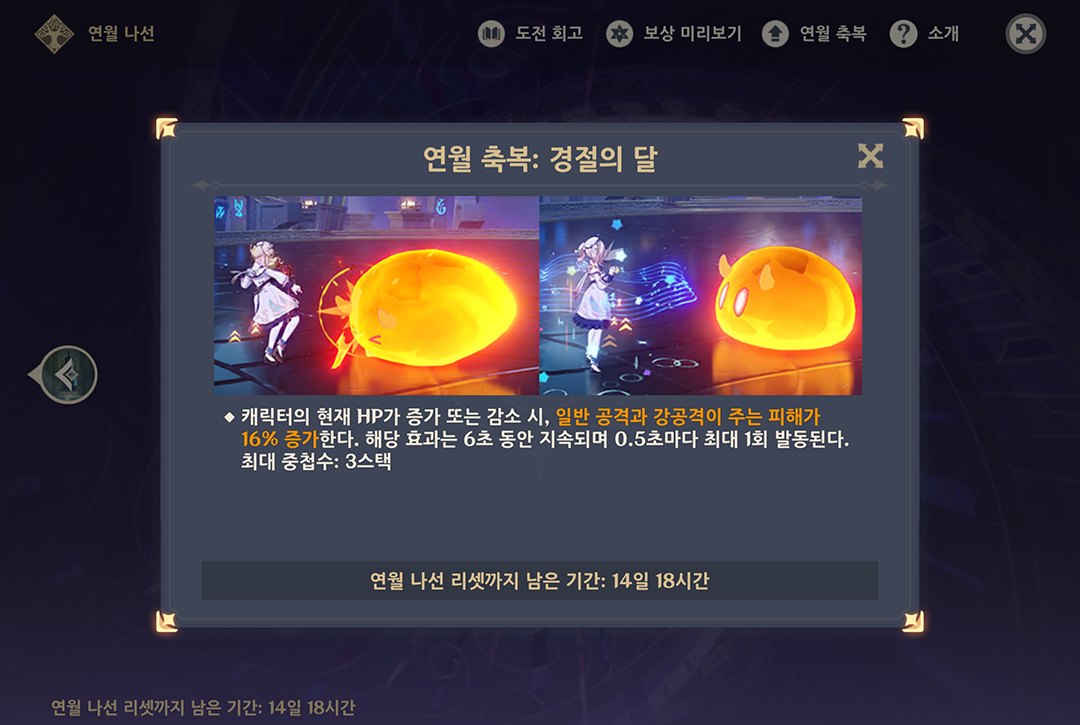 1기 연월 축복 : 캐릭터의 현재 HP가 증가 또는 감소 시, 일반 공격과 강공격이 주는 피해가 16% 증가한다. 해당 효과는 6초 동안 지속되며 0.5초마다 최대 1회 발동된다. 최대 중첩수: 3 스택으로 일단 HP증가 감소하면 생각나는 캐릭터가 이전에 픽업한 리니와 이번에 픽업 중인 '느비예트'와 '호두'가 있습니다.