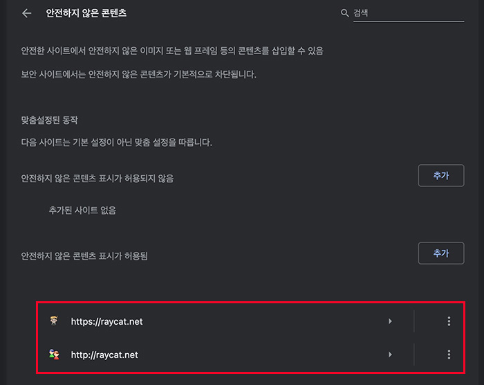 아래쪽에 '안전하지 않은 콘텐츠 표시가 허용됨' 옆에 보면 추가 버튼이 있는데 이 버튼을 누르고 본인 도메인을 추가해 두면 크롬에서 접속이 차단되던 2차 도메인으로 접속할 수 있습니다.