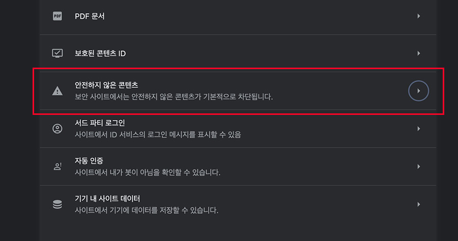 '개인 정보 보호 및 보안 항목'에서 아래로 계속 스크롤해서 밑으로 내려가보면 '안전하지 않은 콘텐츠 항목'이 있습니다.
