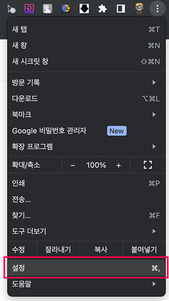 크롬 브라우저 맨오른쪽에 메뉴 버튼인 점 세개를 누르고 설정을 클릭합니다.