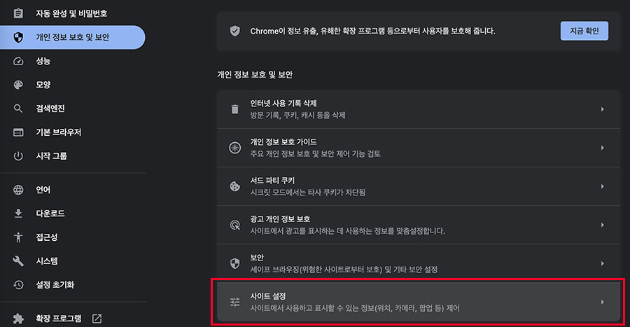 크롬 설정에서 개인 정보 보호 및 보안 - 사이트 설정을 클릭합니다.