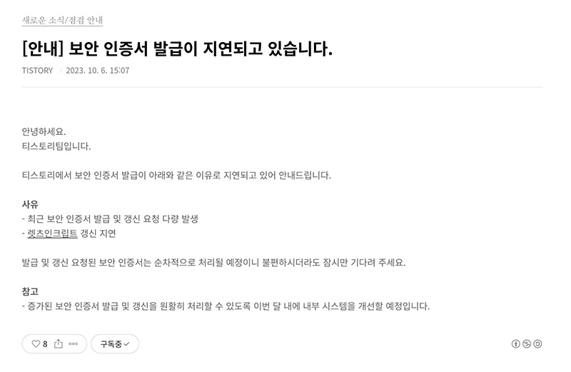 마침 티스토리에서도 보안인증서 발급 지연 문제로 인해 공지가 나와 있습니다. 순차적으로 처리가 되고 있다고 하니 참고하세요.