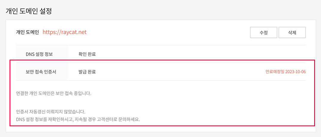 지금까지 한번도 문제가 있었던 적이 없었는데 갑자기 2023년 10월 6일 새벽에 인증서가 만료되며 갱신이 안되고 있습니다.