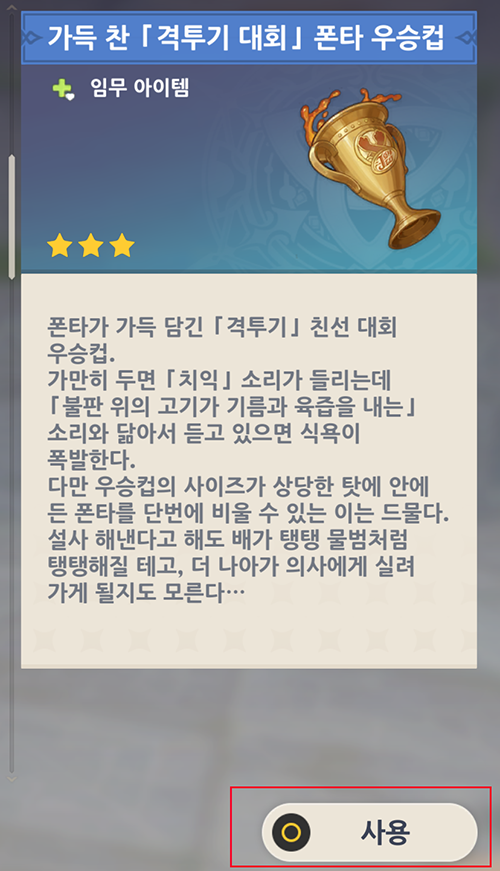 폰타 마시기를 누른 후 배낭을 열어보면 '격투기 대회 폰타 우승컵'이 '가득 찬 격투기 대회 폰타 우승컵'으로 바뀌어 있으며 아래쪽에 보면 사용할 수 있음을 알 수 있습니다.