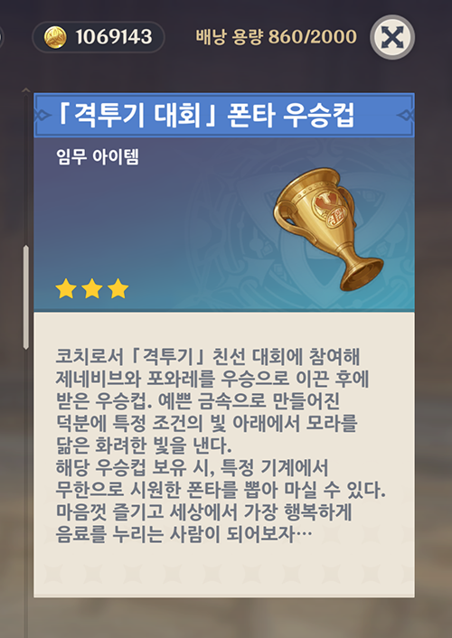 '불끈 쥔 지혜 와 용기'를 클리어하고 임무 아이템을 받고 아이템의 설명을 자세히 보면 '해당 우승컵 보유 시, '특정 기계에서 무한으로 시원한 폰타를 뽑아 마실 수 있다.'라는 설명이 있습니다.