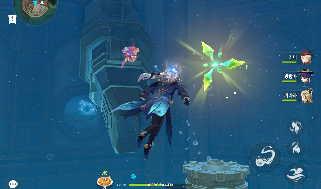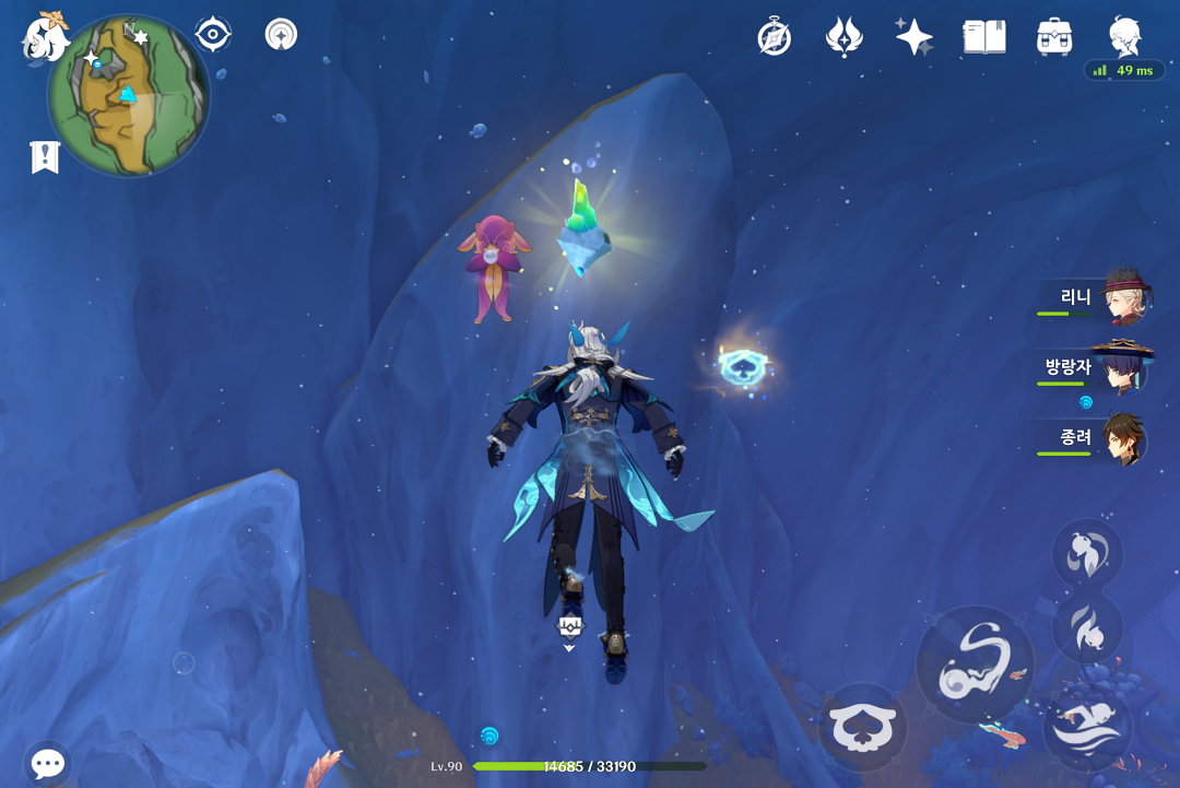 2번 째 물큐브에 있는 신비로운 광석은 바로 아래의 해파리 능력으로 바위를 깨면 안쪽에 바로 있습니다.