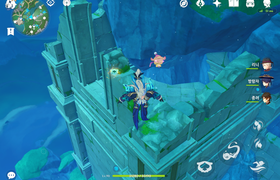 아래쪽에 있는 기계장치옆 물 포털로 진입하면 바로 기계장치 위로 이동하며 신비로운 광석을 획득할 수 있습니다.