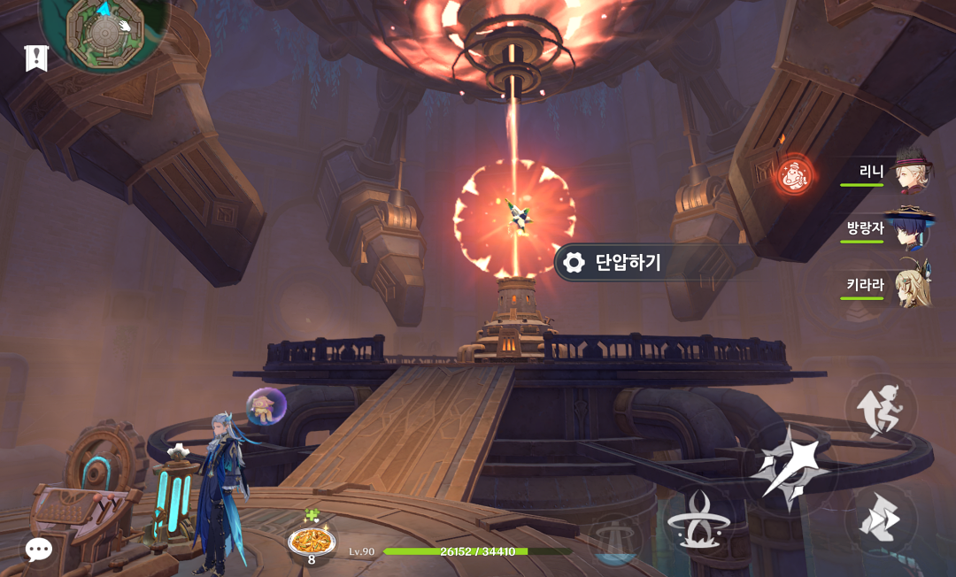 아르케 광석을 단압하는 방법은 쉬운데 단압 기계 장치가 있는 곳의 밸브를 잠그고 몇 가지 쉬운 기믹을 풀고 아르케의 광석을 놓고 광석이 위 캡처 화면처럼 에너지가 모일 때 단압하기를 누르면 됩니다.