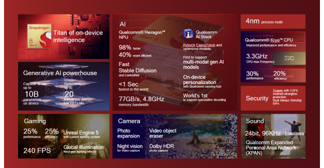 퀄컴에서 제공한 보도자료를 정리해 보면 AI 엔진과 관련된 내용이 많으며 그리고 Wi-Fi7 제공과 전력 효율성 업그레이드 게이밍 기능에 대해 이야기하는 것을 보면 애플의 A17 프로세서에 대응한 모바일 AP로 보입니다.