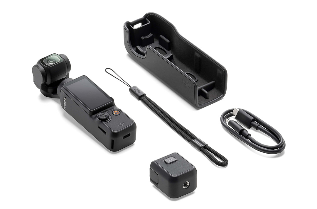 기본 구성품을 보면 짐벌 카메라, 보호커버, 손목 스트랩, Osmo Pocket 3 핸들 (1/4” 나사선)이 포함되어 있습니다.