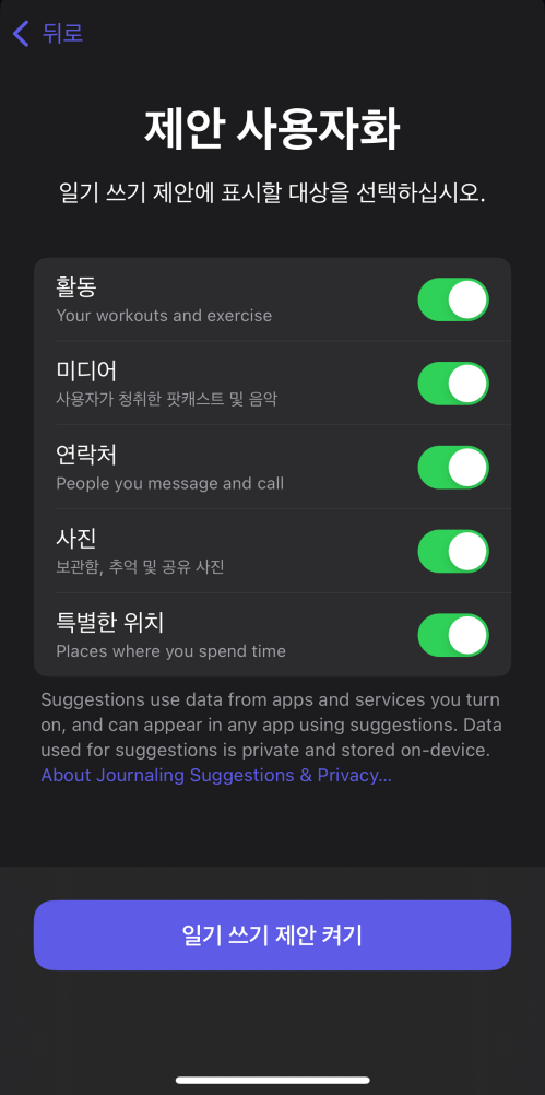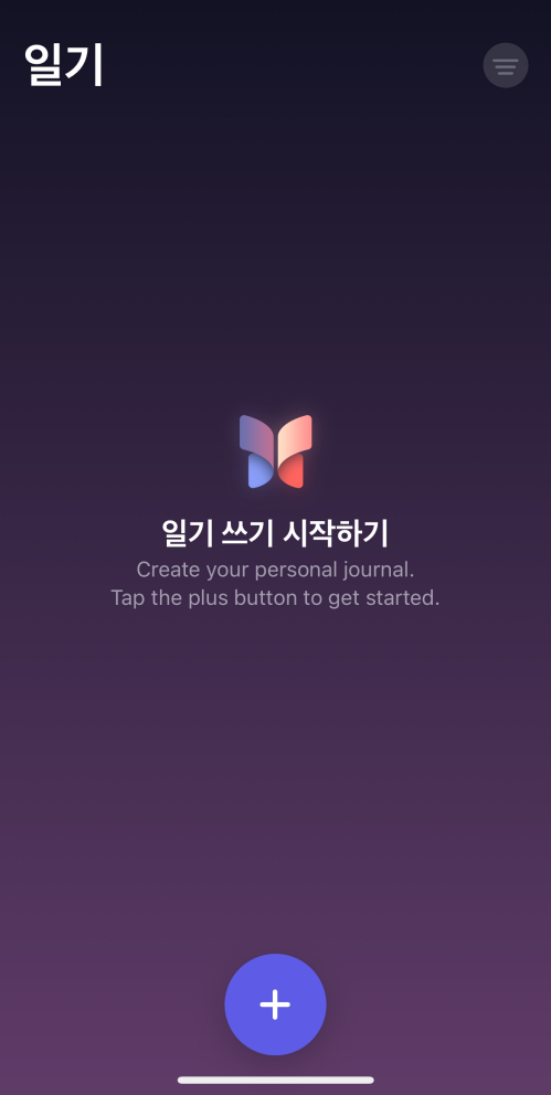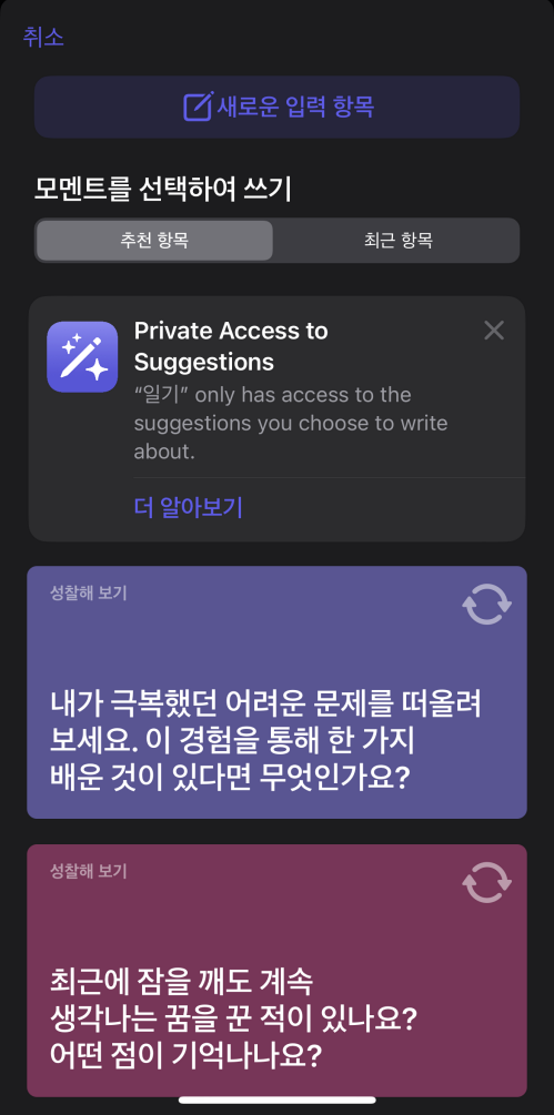 앱을 실행하면 일기에 작성할 영감이라고 해야 할까? 애플워치의 마음 챙기기와 비슷한 글을 작성할 소재거리에 대한 영감의 문장을 앱에서 제안하고 있습니다.