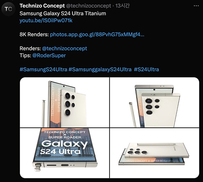 내년 1월 출시가 될 거라 예상되는 갤럭시 S24 울트라의 렌더링이 공개되었습니다.