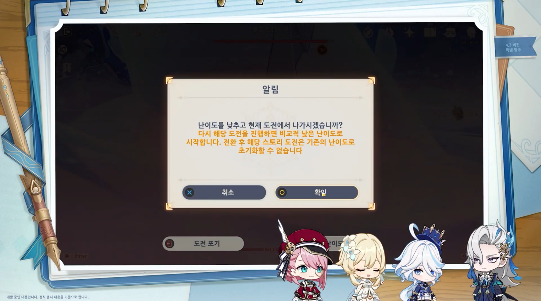 그리고 원신 4.2 버전부터 신규 유저들을 위해 주간 보스나 마신 임무 진행 중 비경에서 도전을 실패하면 난이도를 낮춰서 다시 진행할 수 있는 시스템이 도입됩니다.