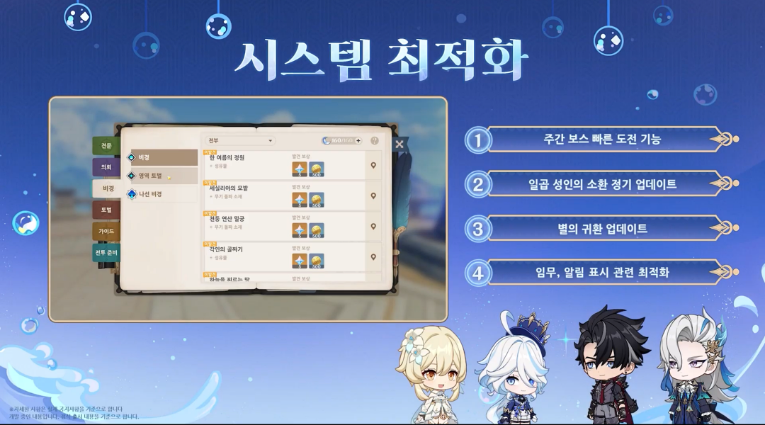 그리고 원신 4.2 버전에서 시스템 최적화도 진행되는데 신규 유저들을 위한 '주간 보스 빠른 도전', 자주 플레이하지 않지만 일곱 성인의 소환 업데이트가 있으며 복귀 유저들을 위한 보상도 업데이트되는 '별의 귀환 업데이트'가 있습니다.