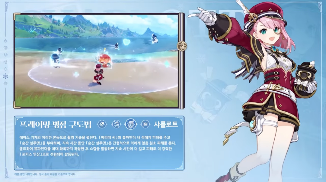 샤를로트는 이미 이전에 스토리에서 만나서 낯이 익은데 법구를 사용하며 얼음원소 캐릭터로 사진 기자란 직업답게 카메라를 사용하는 것처럼 몹을 공격합니다.
