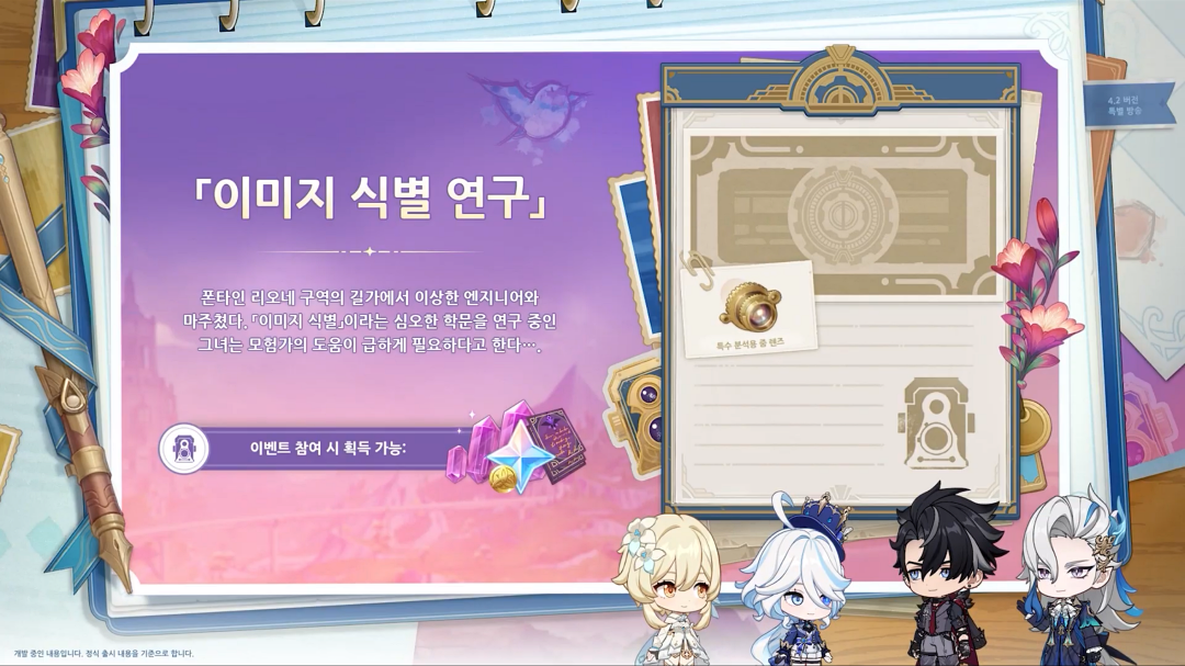 그리고 '이미지 식별 연구'는 필드에서 사진 찍는 이벤트인데 이 이벤트를 클리어하면 보상으로 '특수 분석용 줌 렌즈'를 보상으로 획득할 수 있습니다.