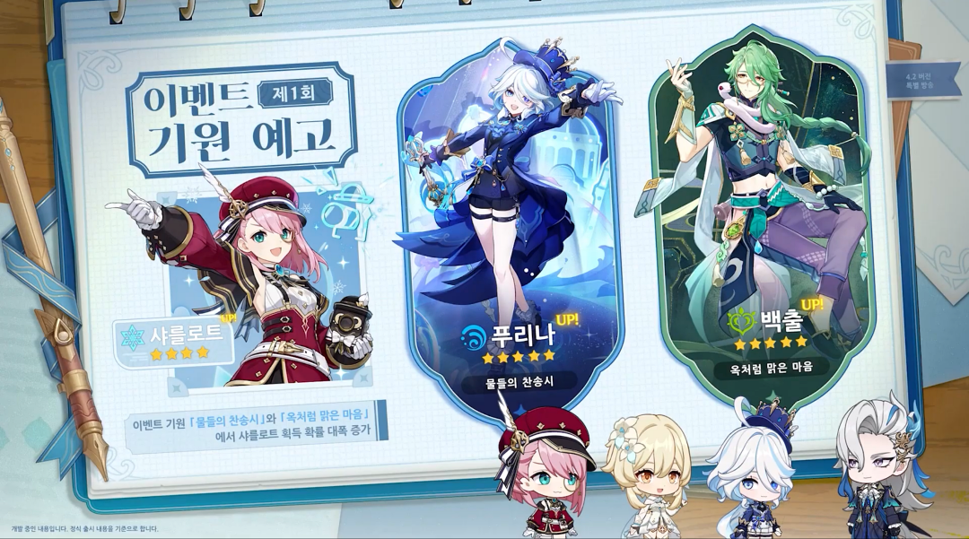 전반부 캐릭터 5성 기원은 푸리나와 백출이며 4성 캐릭터에는 샤를로트가 포함되어 있습니다.