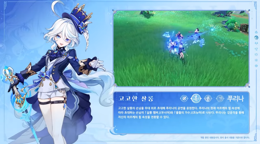 푸리나는 원소 스킬로 소환수를 필드에 소환해 공격하고 소환수가 필드에 있으면 물 위를 걸을수 있습니다. 코코미가 원소폭발후 물위를 걷는 것과 같은 스킬을 가지고 있습니다.