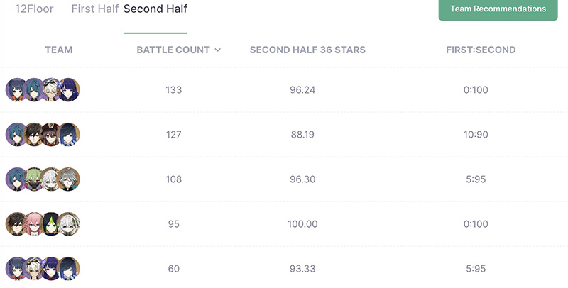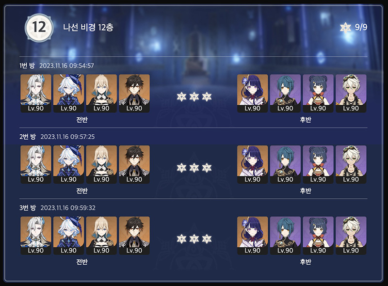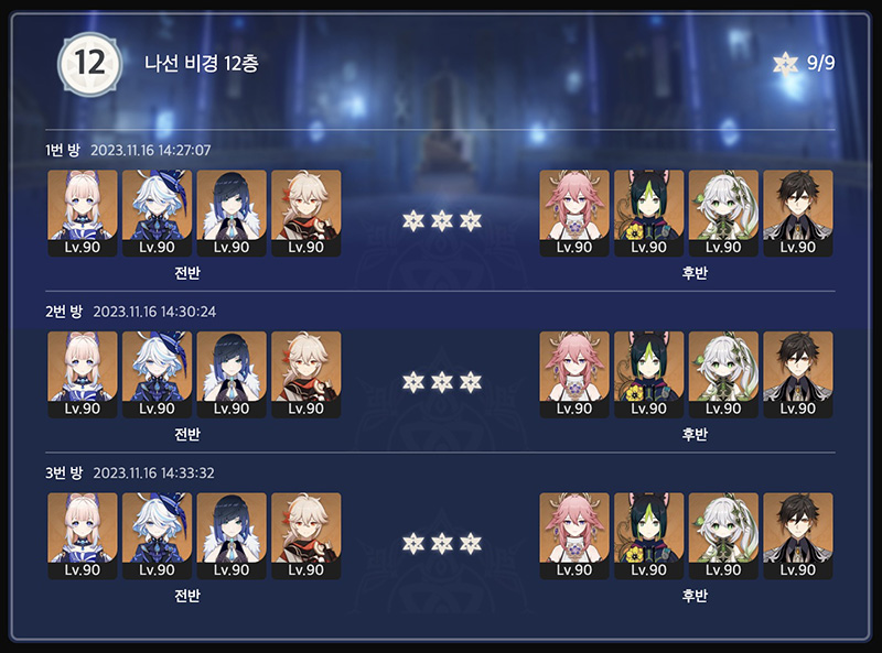 아래는 제가 좀 다양하게 사용해 본 이번 원신 4.2 버전 12층 파티 조합입니다.