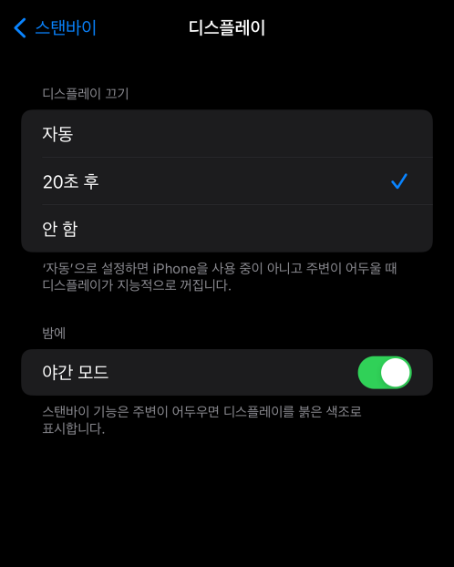 위 기종의 아이폰이 아닌 경우 AOD 기능을 지원하지 않기 때문에 스탠바이 모드를 사용해도 상시표시가 안되며 자동으로 꺼지게 됩니다.