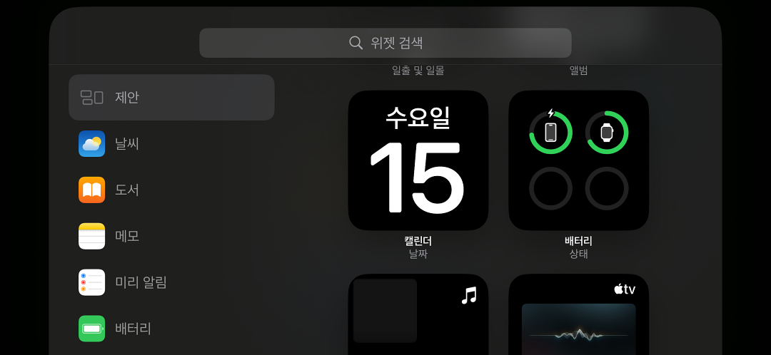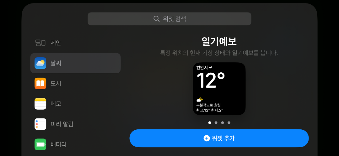 화면에 추가하고 싶은 기능이 있는 위젯을 선택 후 추가하면 됩니다.