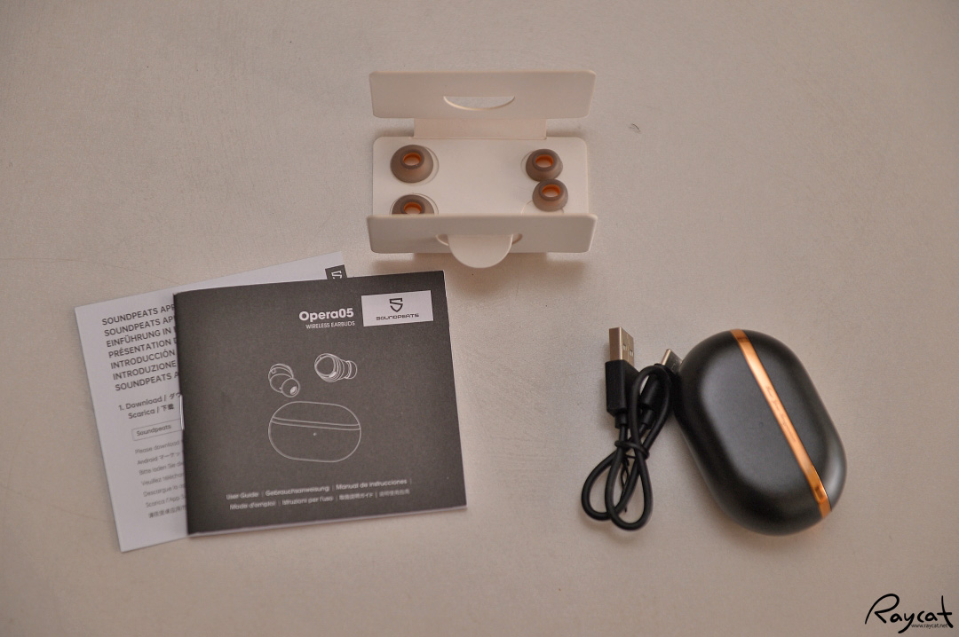 오페라5 패키지 구성품은 사용설명서, 이어팁. 이어폰, usb-c 충전케이블, 충전케이스입니다.