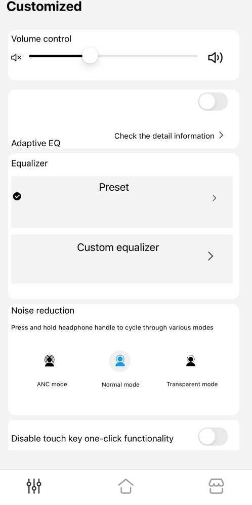 앱은 기본 동작과 함께 노이즈 캔슬링 조정, 이퀼라이저 커스텀이 가능합니다.