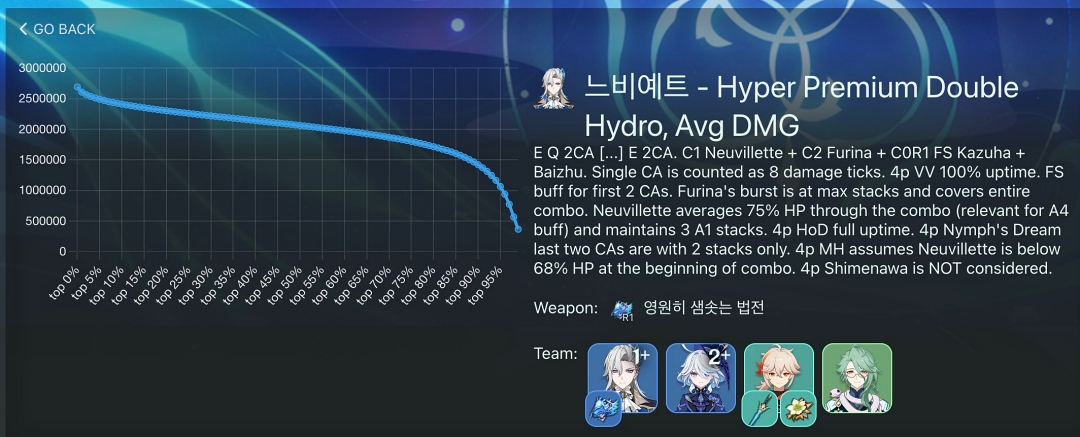 위 유저가 보유한 캐릭터풀에서 그 캐릭터를 골라서 클릭하면 캐릭터를 위한 파티조합과 효율을 볼 수 있습니다.