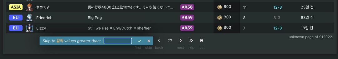 하위권 유저들의 조합을 보고 싶다면 프로필에서 나열된 유저들 순위에서 업적 숫자를 바꾸거나 화살표로 뒤쪽으로 가보면 이곳에 등록된 하위권 유저들의 사용 조합과 성유물도 볼 수 있습니다.