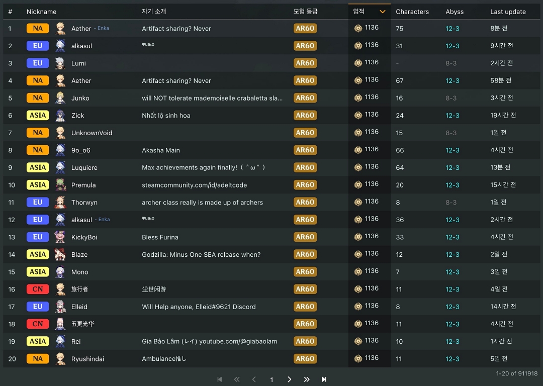 프로필 메뉴에서 업적 숫자를 600~700 정도로 바꾸면 순위권이 낮고 최근 1년 정도 원신을 플레이한 유저들이 보입니다.