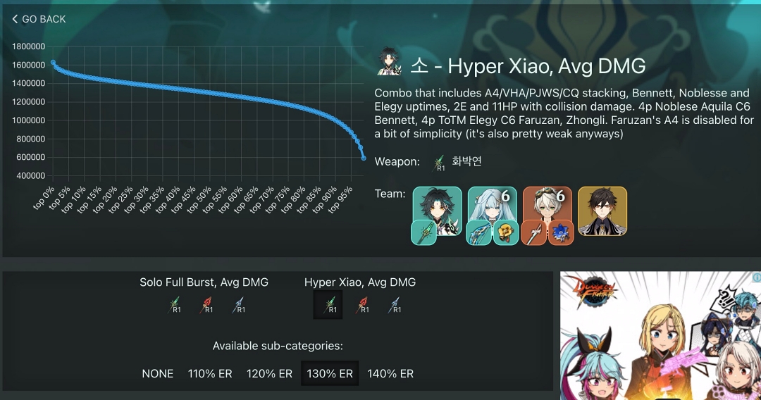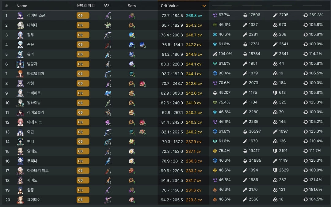 단 상위권 유저들만 보면 모두 게임을 2~3년 이상 플레이한 사람이기 때문에 초보 유저가 보기에 캐릭터의 돌파나 무기 보유도 다르기 때문에 성유물 조합만 참고하는 것이 좋습니다.