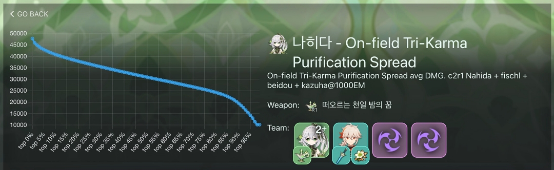 위 유저가 보유한 캐릭터풀에서 그 캐릭터를 골라서 클릭하면 캐릭터를 위한 파티조합과 효율을 볼 수 있습니다.