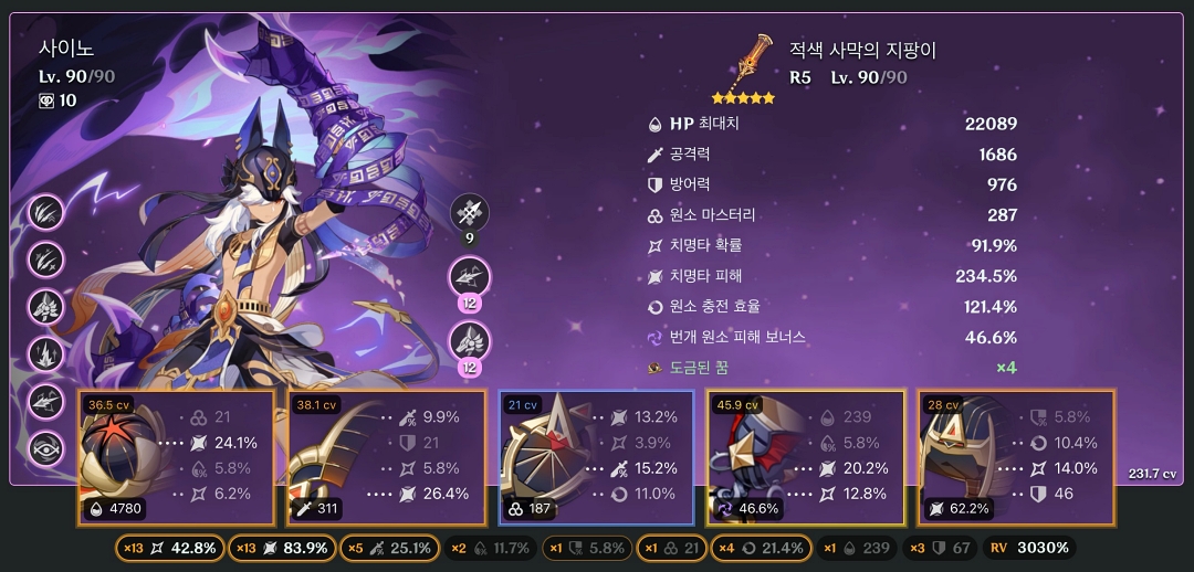 그리고 지금 픽업 중인 사이노의 경우 도금 세트가 가장 효율이 좋은데 상위권 유저들을 보면 대부분 종결 수준의 성유물로 세팅되어 있습니다. 그렇기 때문에 뉴비면 사실 저 스탯을 맞추기 어렵기 때문에 성유물 조합과 성유물 주옵션만 보고 맞춰가는 게 좋습니다.