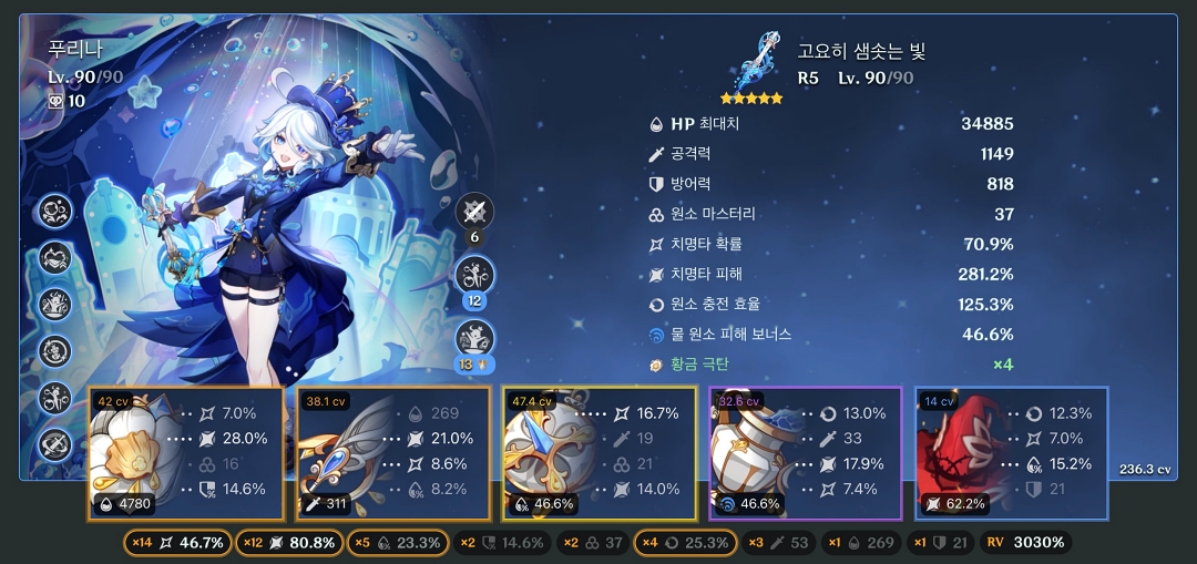 제 경우 아직 푸리나 성유물을 맞추고 있어서 상위 1%의 푸리나 스탯을 확인해 봤는데 상위권의 푸리나는 황금 극단으로 모두 맞추고 Q스킬에 왕관을 준 게 보입니다.