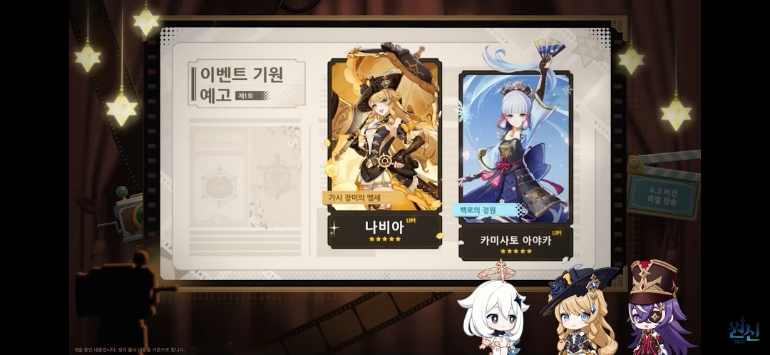 먼저 원신 4.3 버전 픽업부터 정리해 보면 4.3 버전에서 신규 폰타인 캐릭터는 나비아와 슈브르즈가 등장합니다.