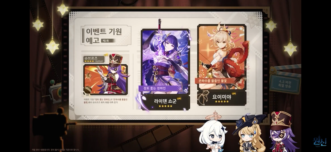 4.3 버전 후반부 픽업은 라이덴 쇼군과 요이미야 그리고 4성 슈브르즈가 나옵니다.